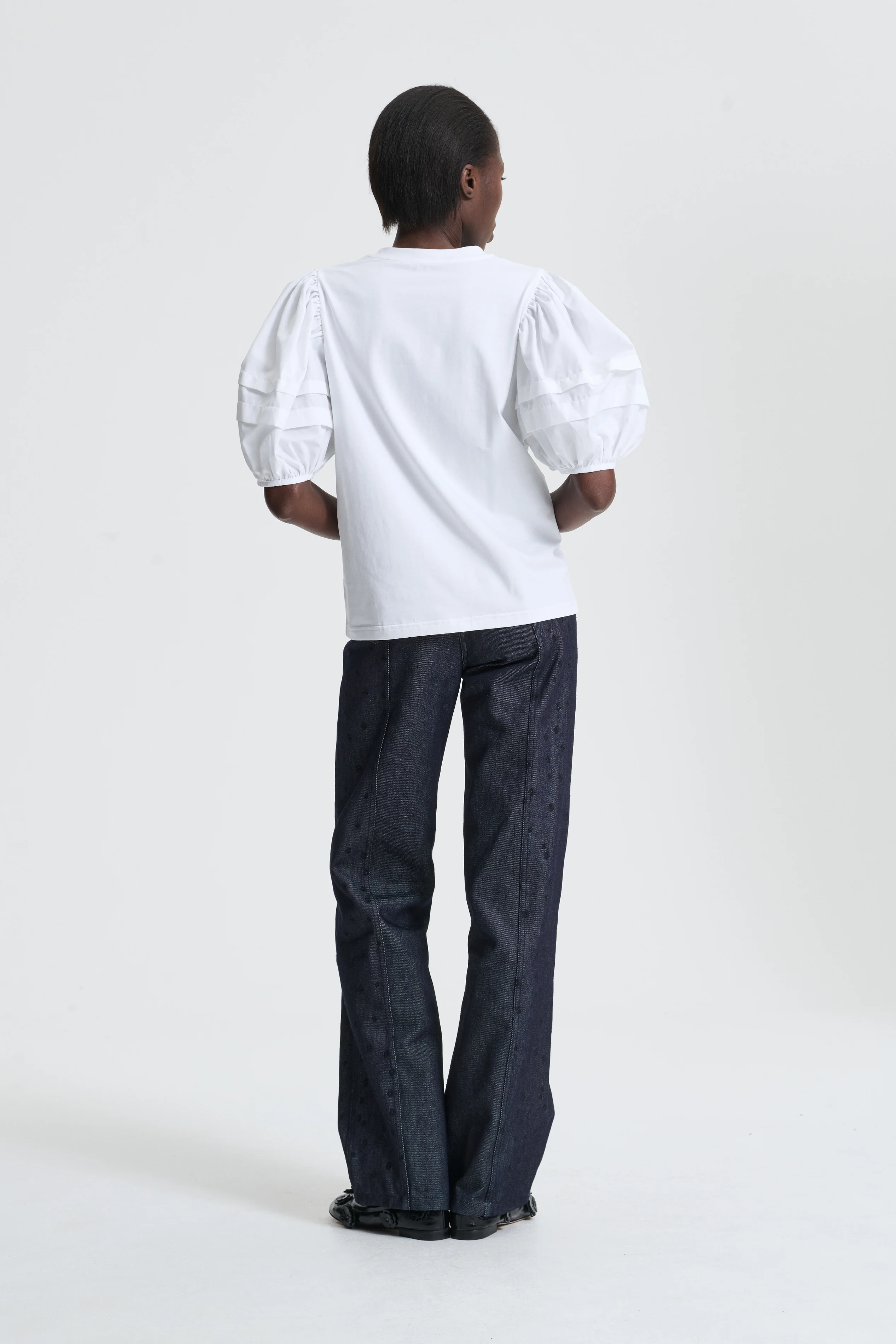 Exploring signature silhouettes in everyday fabrications, the Ben t-shirt. Cecilie Bahnsenâs iconic puff sleeves find new life in jersey, imbuing the staple with her feminine touch, complete with subtle ruffling along the sleeve.