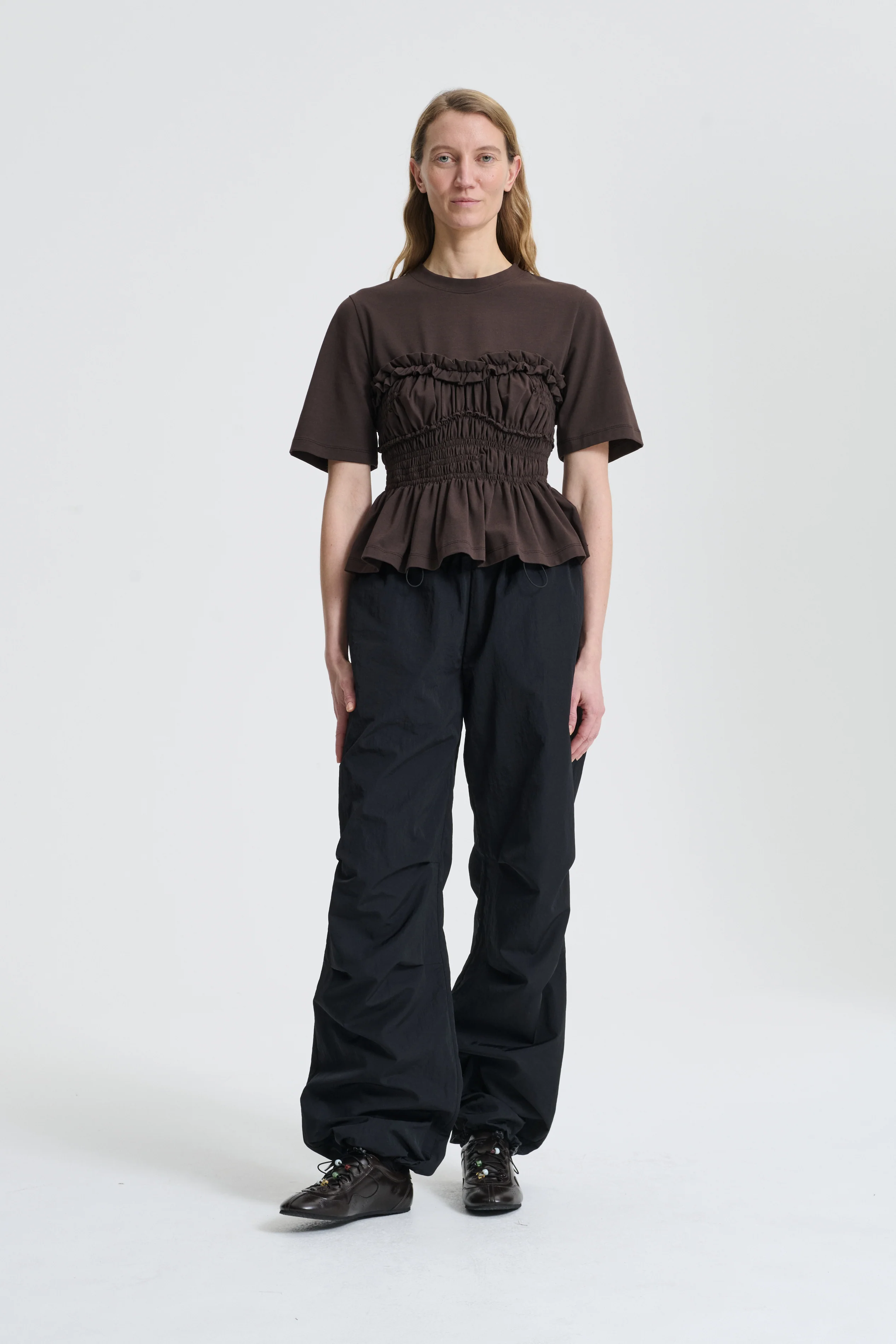 Ease meets elegance with the Vilde t-shirt. Cut from a deep brown jersey and manipulated to create a ruched silhouette, the bodice is a couture counterpoint to the casual tee