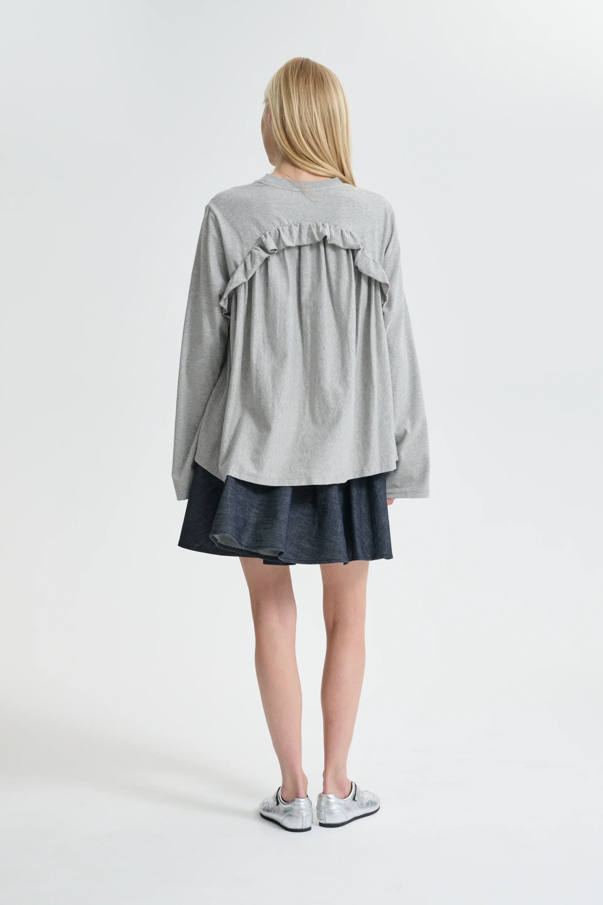 A soft staple, the Alva shirt is crafted in grey melange jersey and elevated with ruffle detailing that curve across the front, balanced by a single sweeping ruffle at the back. An easy, everyday silhouette finished with elegant, sculptural detailing.
