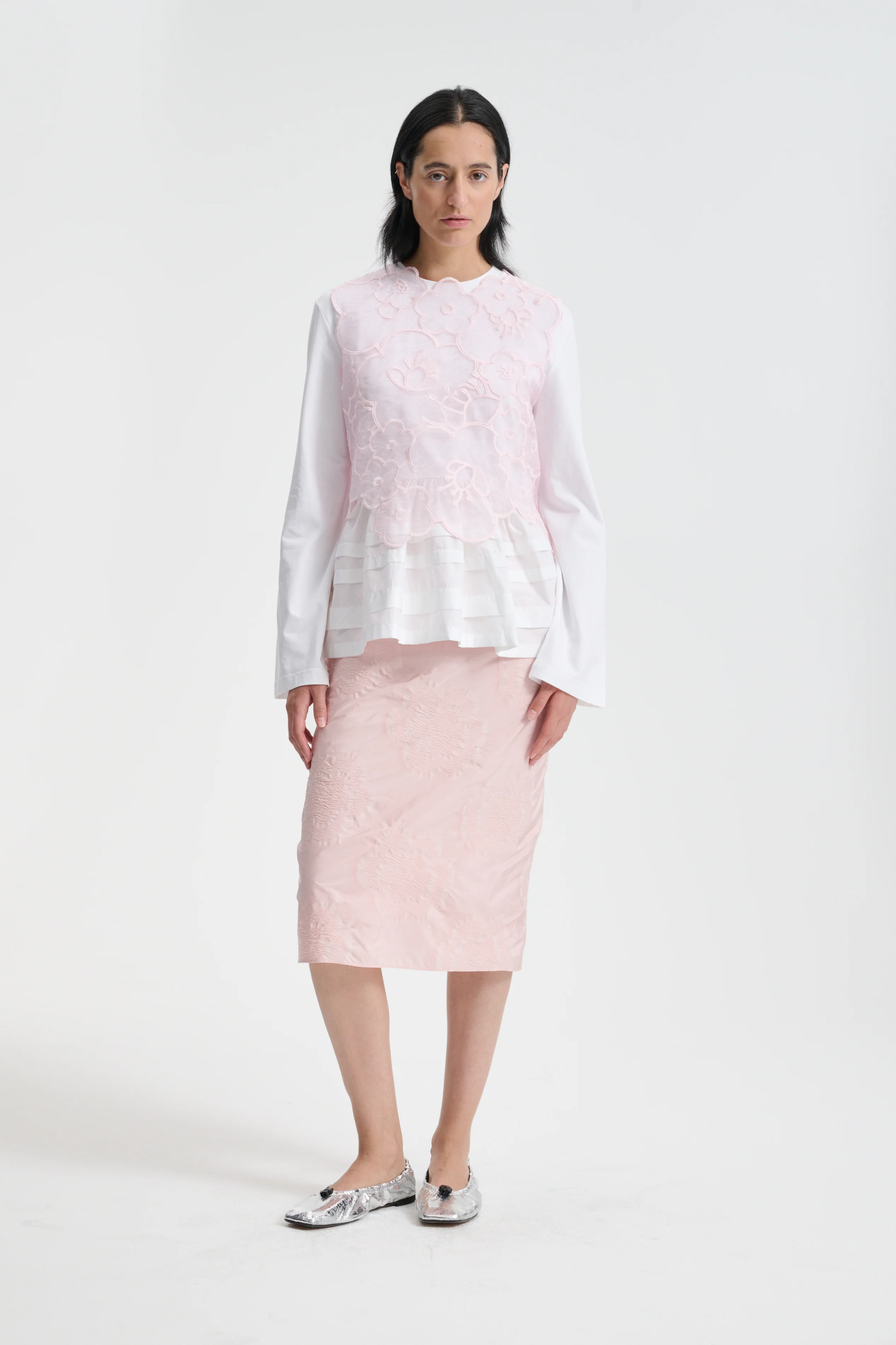 A transitional staple that could only be Cecilie Bahnsenís, the Audrey top. Crafted from white jersey and cotton poplin, slightly dropped shoulders and long, wide sleeves fuse drama with ease. Pleated details across the peplum add texture and dimension to the otherwise relaxed fit.