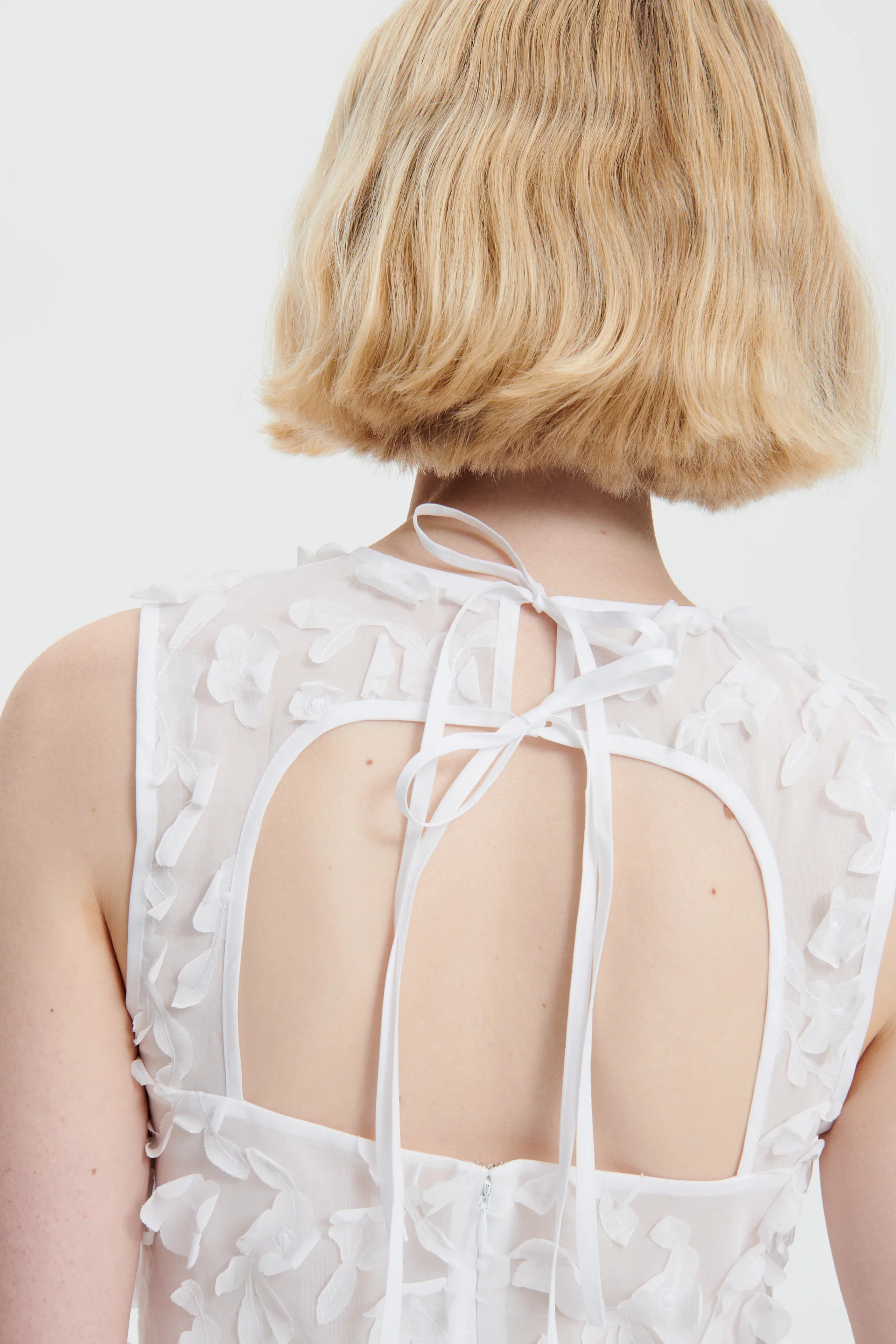 A harmony of embroidered florals come to life in this romantic composition, the Gine dress. Crafted to order in Copenhagen with a viola grid embroidery, subtle hip panels grant gentle volume to the slimmer silhouette. Delicate ribbons tie above a cut out at the back, finished with a zip closure. An airy design that puts Cecilie Bahnsenís admiration for couture details on full display.