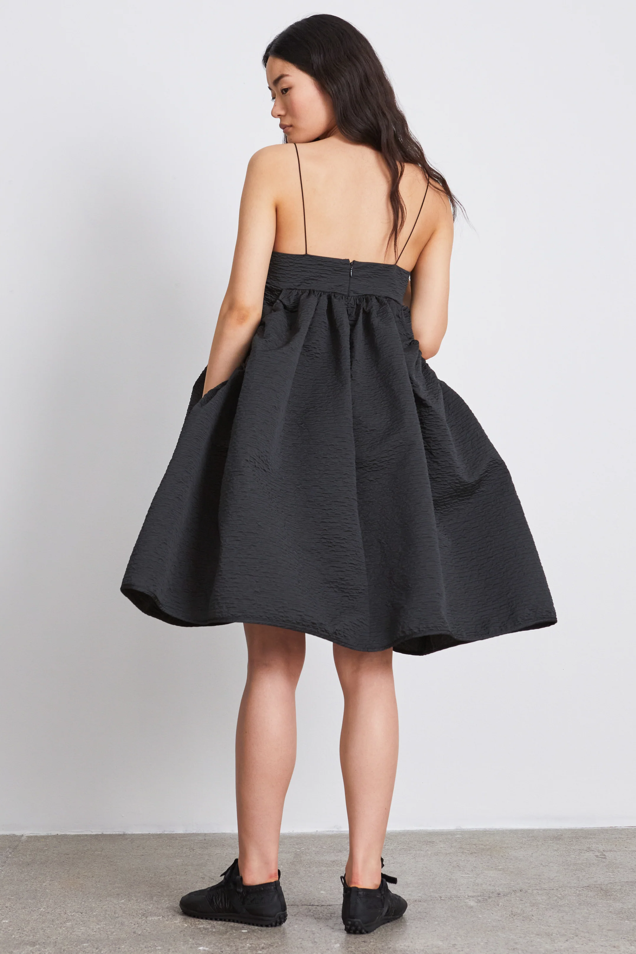Crafted from lightweight stria matelassé, the Lisbeth dress is classically Cecilie Bahnsen. A slim bandeau is held by delicate shoulder straps and balanced by the voluminous skirt that falls slightly above the knee and tapers out from an empire waistline. The Lisbeth dress simultaneously pulls from both Scandinavian minimalism and every-day romanticism.