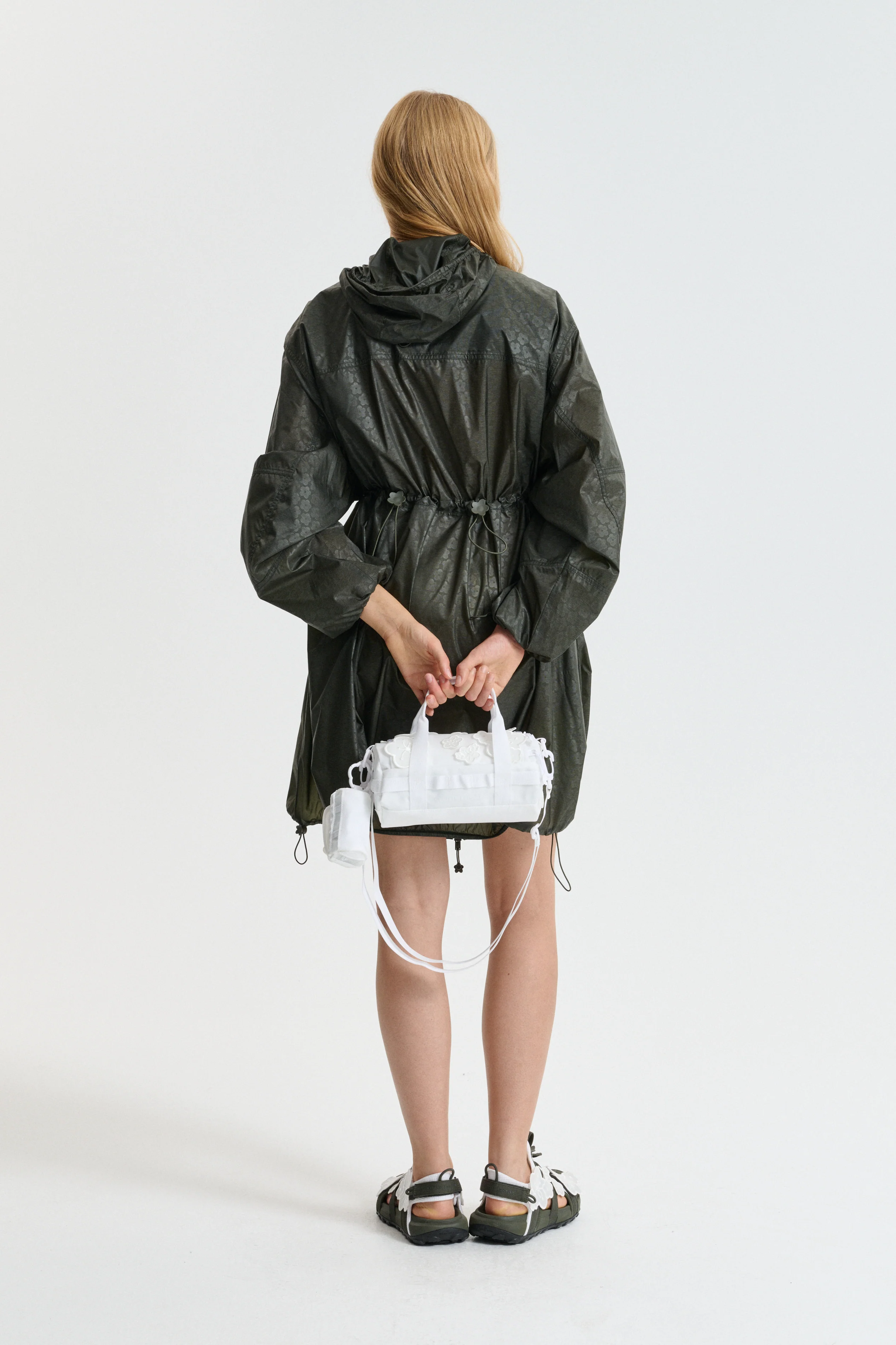 A study of delicacy in a technical world, the Maria clutch is crafted in a water and tear-resistant white ripstop. The floral motif is extended from embroidered patches to a practical carabiner, making it an ideal accessory for everyday exploration. Complete with a removable strap to extend the bag into a crossbody.Â